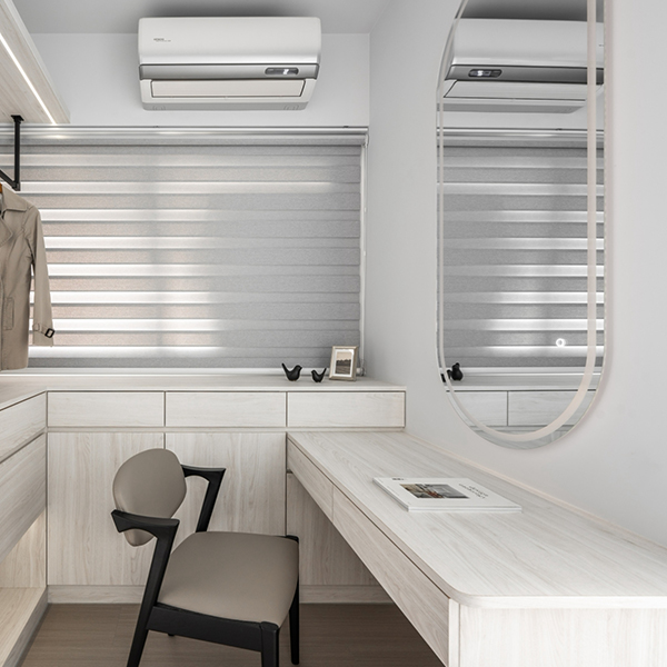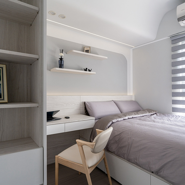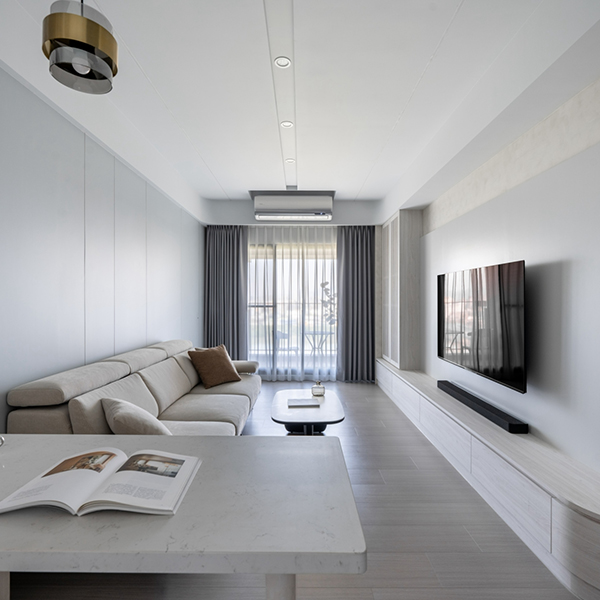 全室天花板與壁面以雪片白色鋪陳,營造出通透明亮的空間基調。電視牆與次臥則巧妙以灰色系跳色,在白色中注入一抹低彩度灰,帶來層次感與視覺焦點。