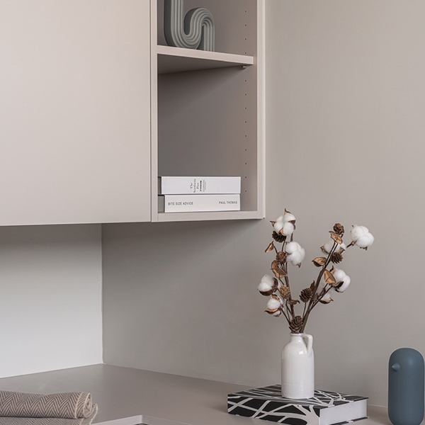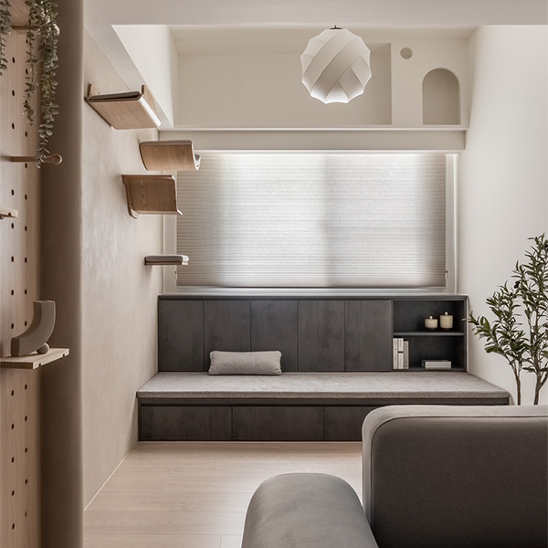 以米色系的異材質的搭配,為空間營造出一種柔和卻有細節的沉靜氛圍感。