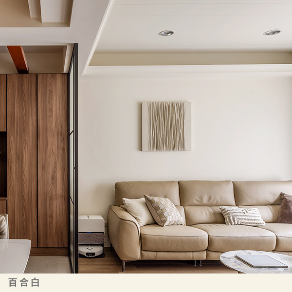 空間以溫潤自然為基底,選用百合白作為天花板與牆面的主色調。純淨而柔和的白,為整體氛圍注入安定與輕盈感,如同自然光灑落般純粹,讓空間在簡約中蘊含溫暖,營造出舒適而宜人的居住體驗。
