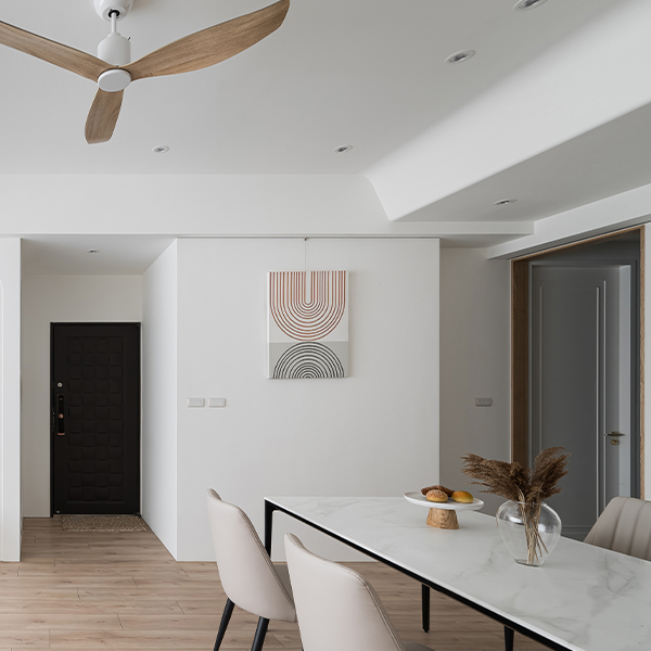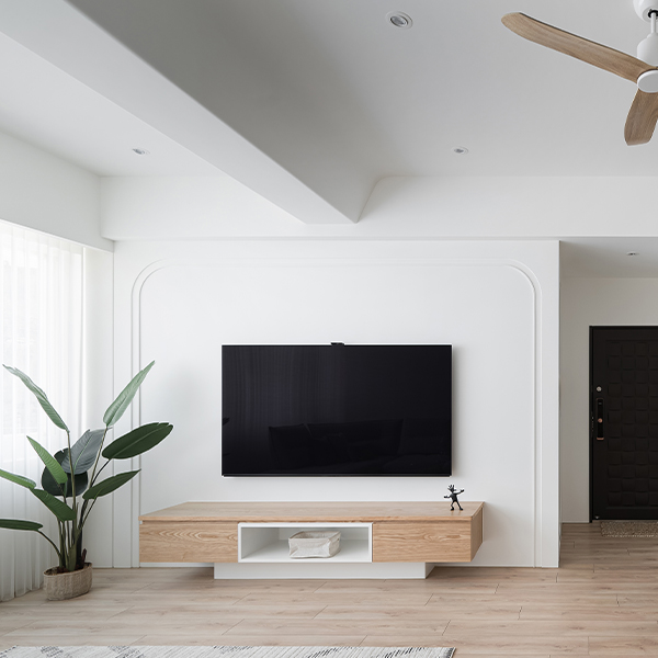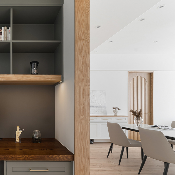 全室以白色與柔和淺灰為搭配,呈現空間的柔和及寧靜,並酌以深灰系點綴空間亮點。