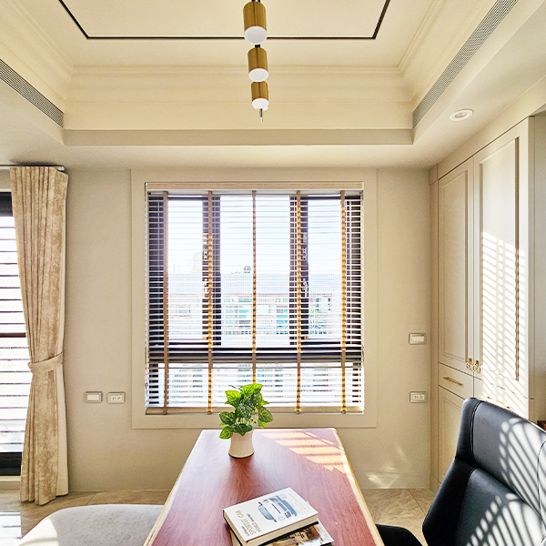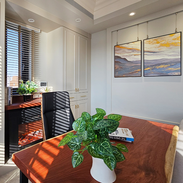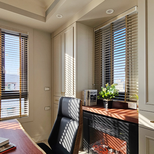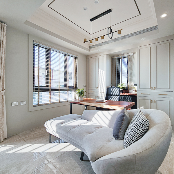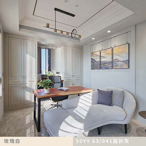 以柔和色調為主牆色,搭配同色系櫃體與米白天花線板,營造優雅沉靜的閱讀氛圍。