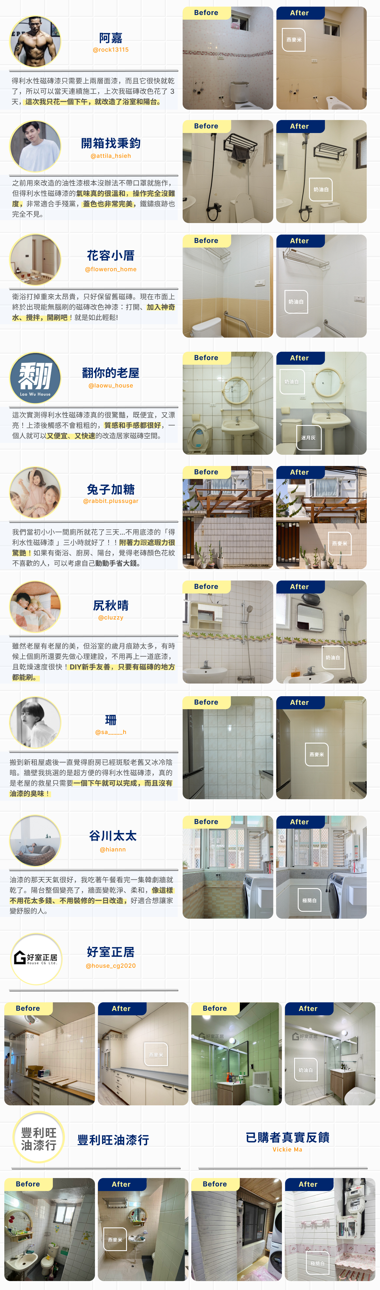 不管是褪色、清不掉髒污的磁磚表面、容易卡陳年霉垢的磁磚縫、殘留的鐵鏽痕跡,這些明顯的磁磚瑕疵,擁有超強附著力的得利水性磁磚漆都能輕鬆遮蓋,只要一層就能基礎覆蓋、兩層就能平滑如新,打造「無縫新美感」。