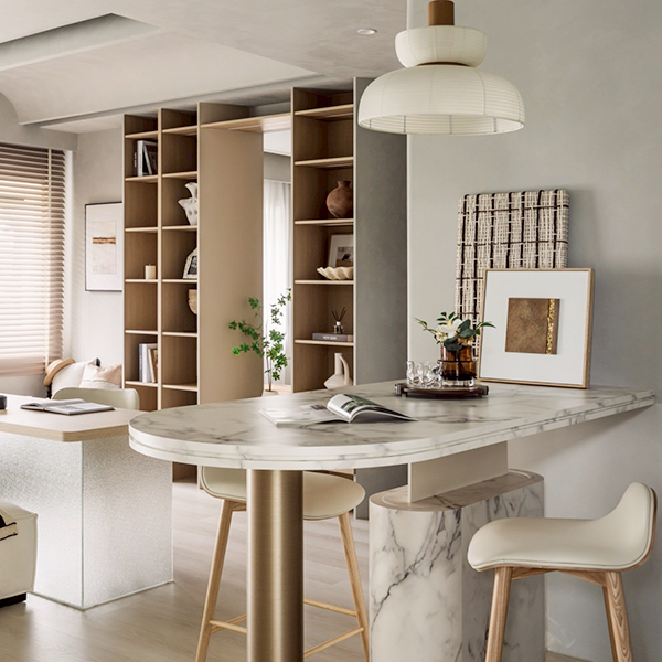 以弧形語彙貫穿全室,讓空間在柔光之中延展出節奏與深度。天花的轉折、櫃體的曲面、石紋的延展,共同構築出秩序裡的柔軟。