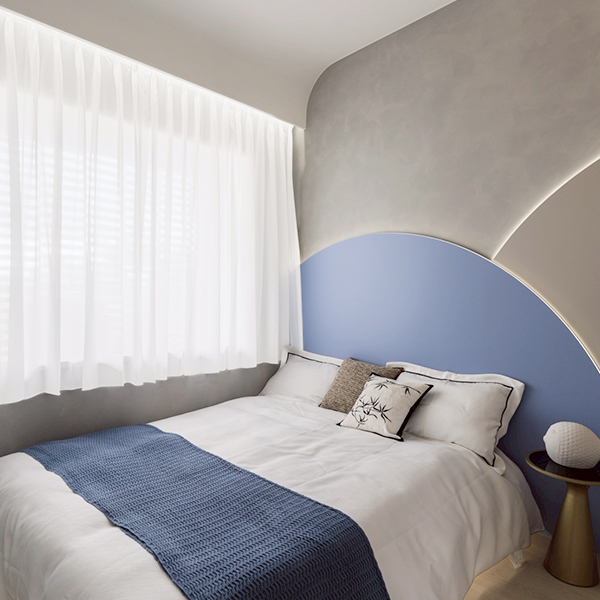 選用霧面塗料、天然木質與柔光石紋,以低飽和的色階建構空間的安定感。